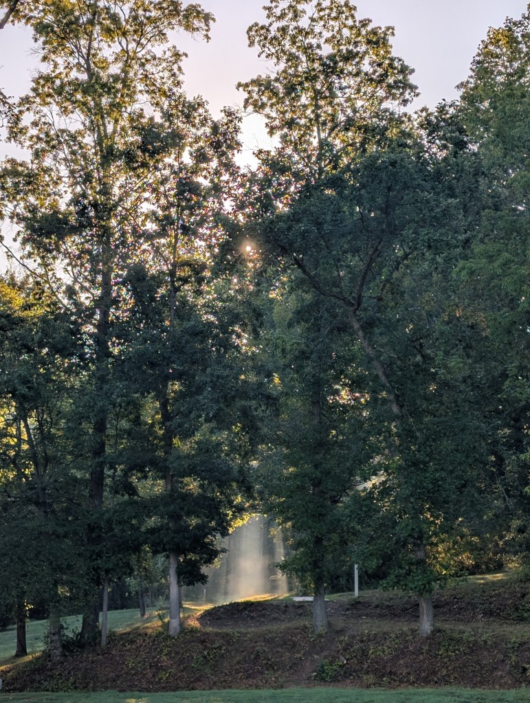 As you can imagine, with the passing seasons my views of the horizon keep changing. At 7:00 in July, the sun was already quite high, but now at the end of October, there is only the promising glow of the sun on its way. Each morning offers a varying palette of color–deep purples and blues, pale yellows, or bright oranges and pinks. There are times when clouds completely hide the sun and other times when they allow a few lovely sunbeams to shine through. On foggy mornings, the blanket of gray lends itself to quiet contemplation. And last week, as I walked in the early morning darkness, the Bridge Park caretaker turned on the parking lot lights for me. The lights washed out my view of the morning sky, but his kindness warmed my heart.