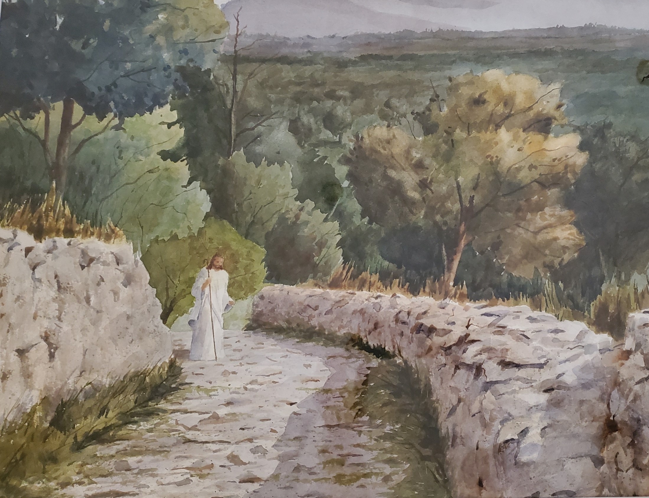 My dad painted this watercolor of Jesus on the Mount of Olives for me years ago. I love that even as I cannot see what is around the bend, Jesus is waiting for me to follow him… and I know that he will be with me all the way. (Photo by Karen.)
