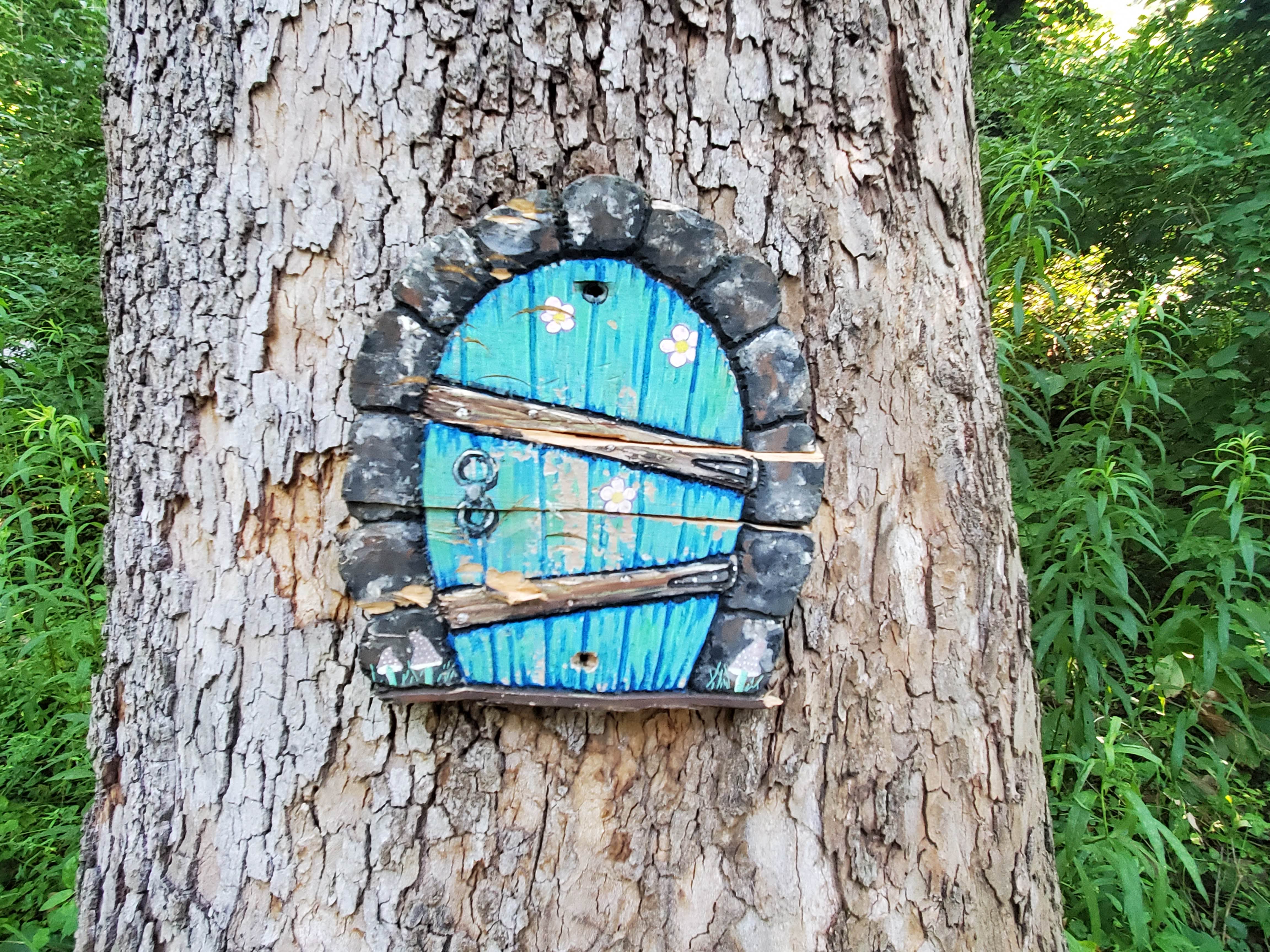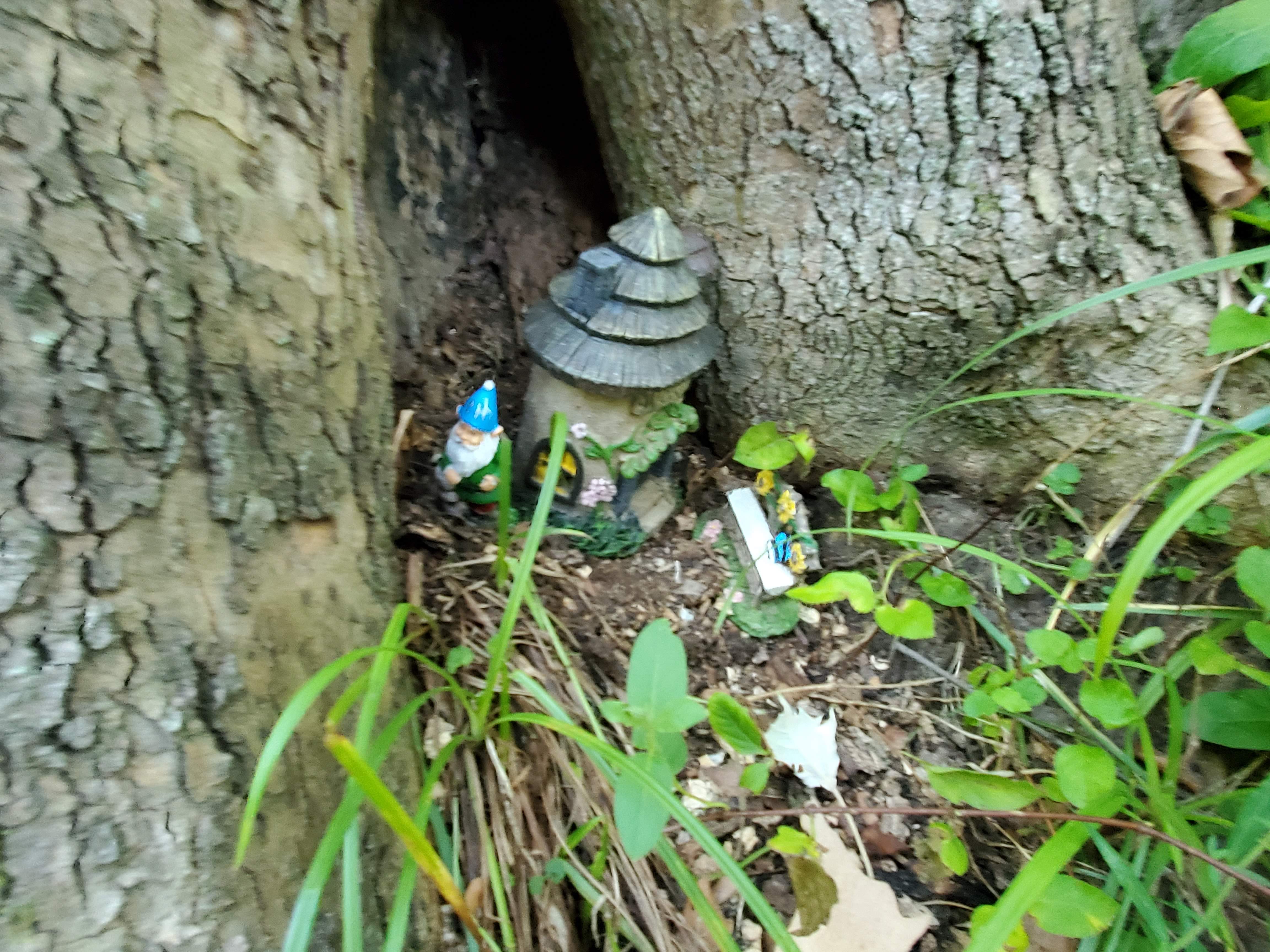 My happiness moment for today was a bit of whimsy along the trail at the city park where I walked. I have followed this path many times, and only today – because I was paying attention, seeking joy – I noticed some of the fairy houses that were hidden under leaves and against roots.