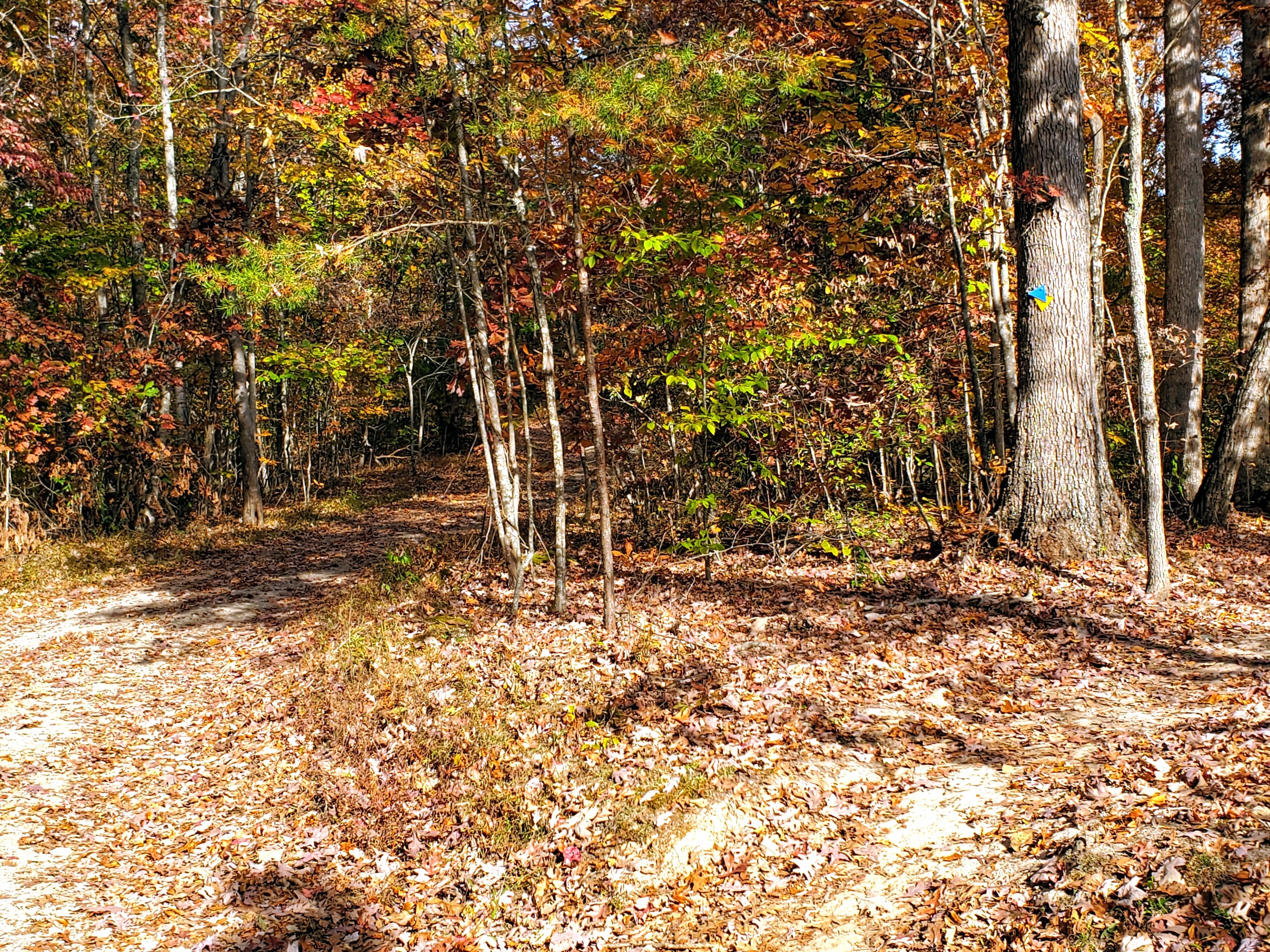 I had completely missed the little blue and yellow triangles that marked our route! (If you look closely at my photo, you can see these triangles on the larger tree trunk.) Since the roadway was easier to see and follow, I neglected to pay attention to the trail marker and smaller path leading elsewhere into the woods.