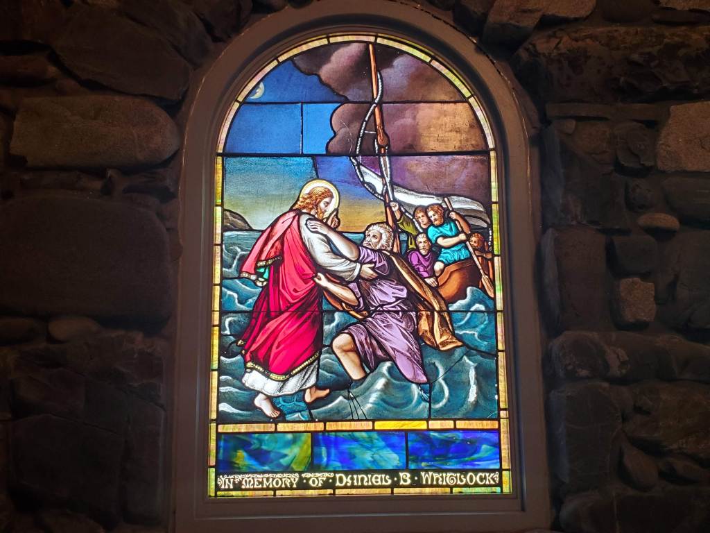 As Jim and I were quietly exploring St. Ann’s Episcopal Church, I turned into a small corner of the sanctuary and came upon this stained-glass image of Jesus rescuing fearful Peter from the water. Tears suddenly filled my eyes, for I recognized this as a God-moment. Back in January, when I chose my guiding word for this year–Venture–I had also chosen a few verses from this Bible story to enrich the meaning of my word: