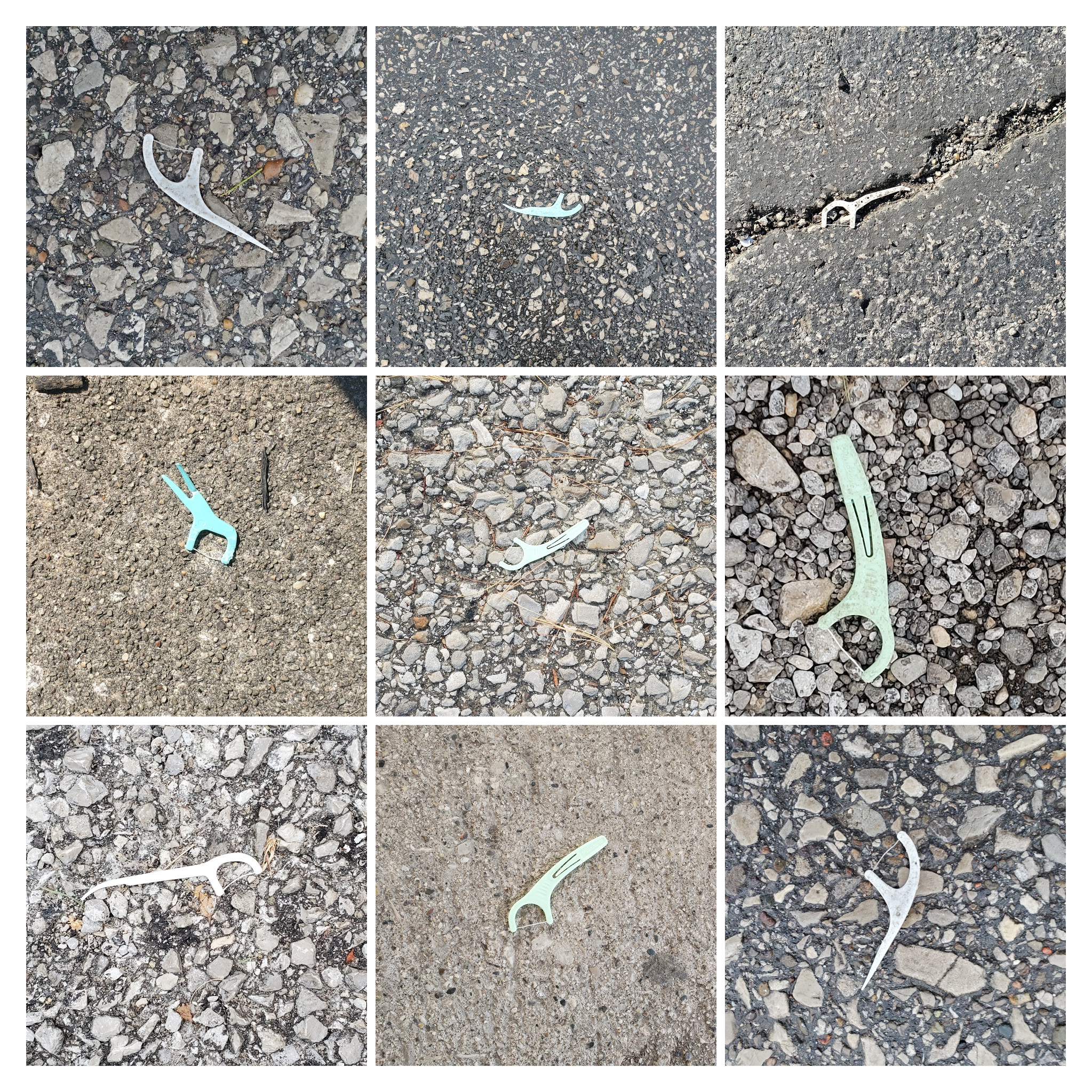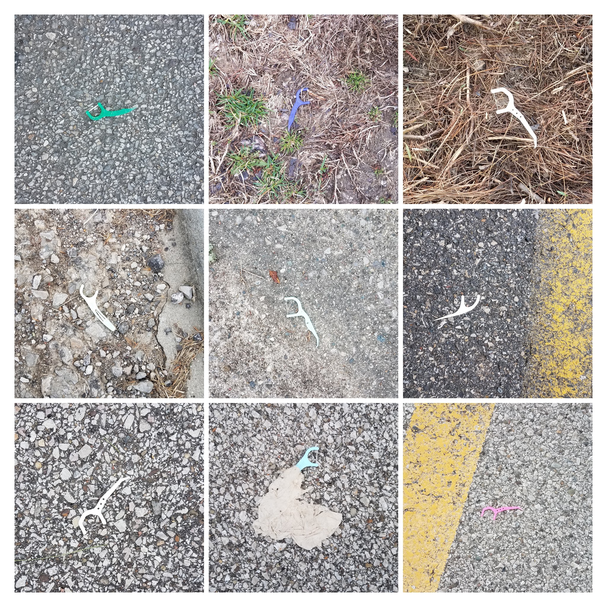 But soon these funny moments became eye-opening moments. I never anticipated that I would find so many discarded flossers simply by paying attention. Our little joke gradually lost its humor; it seems that people care more about their dental hygiene than they care for our earth. One might cast aside a used flosser without any consideration… What harm can this one little bit of trash do? But here, just in my small part of the world, I have already found more than fifty (not all are shown).