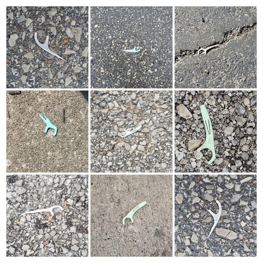 A few years ago, my son-in-law and I laughed about his penchant for tooth flossing, after he admitted that he likes to keep them in handy places all around the house. Shortly after our time together, I was on my morning walk when I noticed a tooth flosser on the ground, so I took a photo and sent it to him with a greeting, “Thinking of you!” That began my practice of taking a photo each time I found one of these little tools, so I could send him another teasing text message.