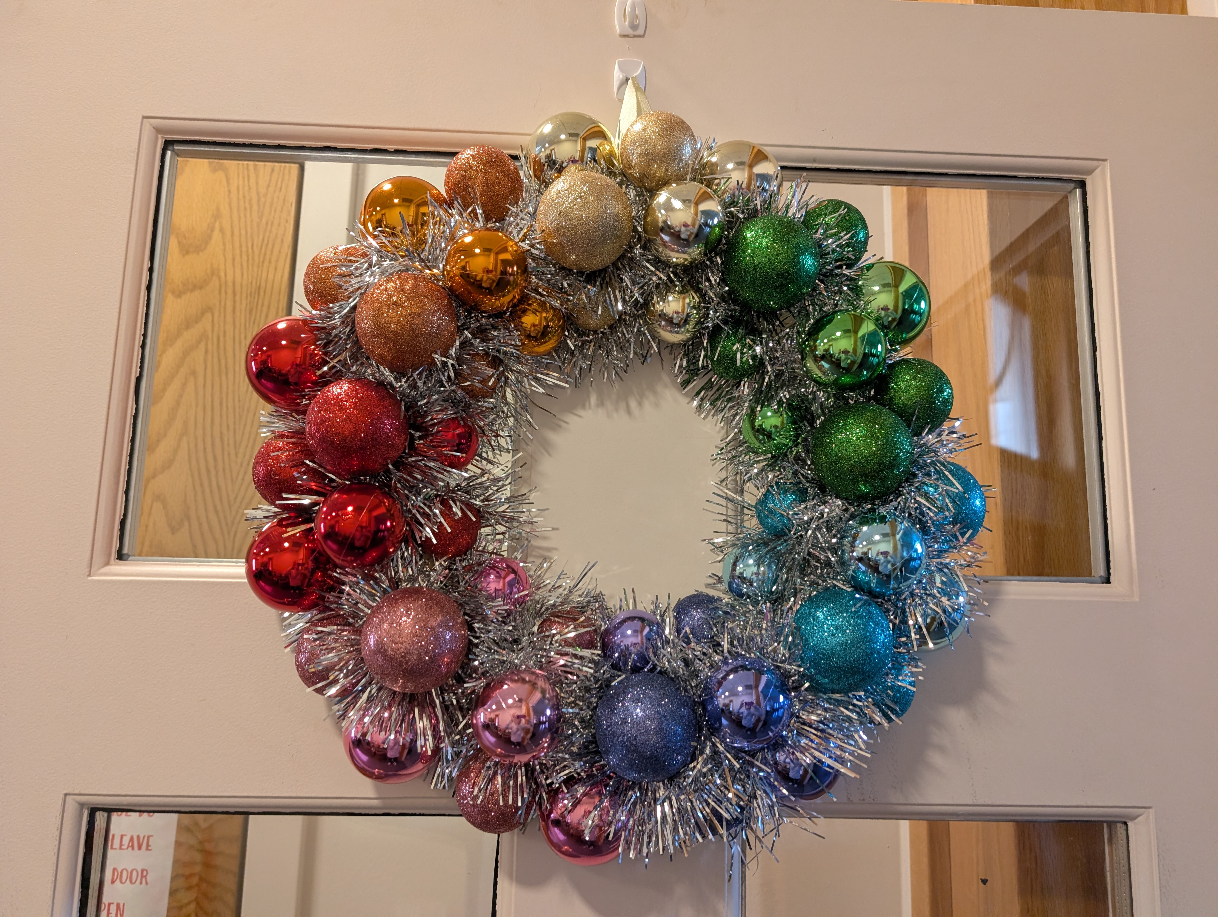 I was pleasantly surprised to find this cheerful wreath on the door to my office when I arrived one morning last week (I serve as the Parish Administrator at our local Episcopal Church). A few hours later, I learned from Father Andy that the gift was from one of our dear members, Angie! I was touched by her kindness and quickly composed a text message to thank her.