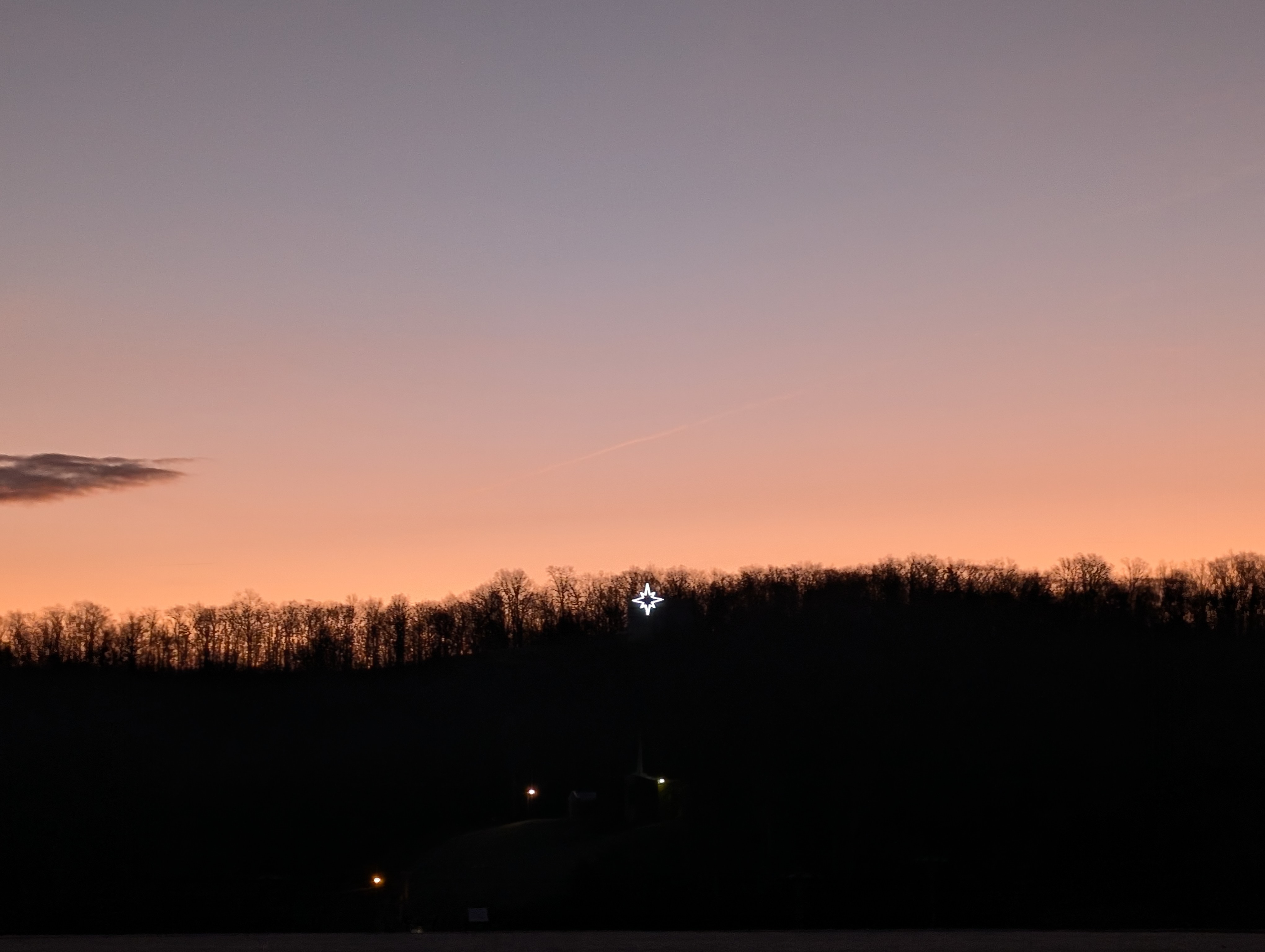 (Photo by Karen–Epiphany star mounted on a hillside water tank. If you look closely, you may be able to see a white outline of a church steeple underneath the star–the star is quite large!)